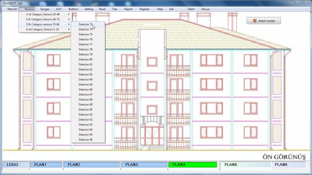 Genel ayarlardaki "Image can't move" iptali kaldırılarak ;kursör imajının üzerinde iken "mouse"un sol tuşuna basılı tutularak pencere üzerindeki istenilen yere sürüklenilerek bırakılır.Bu bölümde dedektörlerin durumu plan üzerinden izlenir.İlgili fenerin butonu "ON" konumuna geldiğinde Dedektörlerin rengi yeşile dönüşür.Eğer dedektörler alarm durumundaise;  kırmızı olarak yanar ve sesli alarm verir.Bu arada da "PLAN4" kategori butonu kırmızı olarak yanıp sönmeye başlar.Ses susturma butonu ile susturulur.